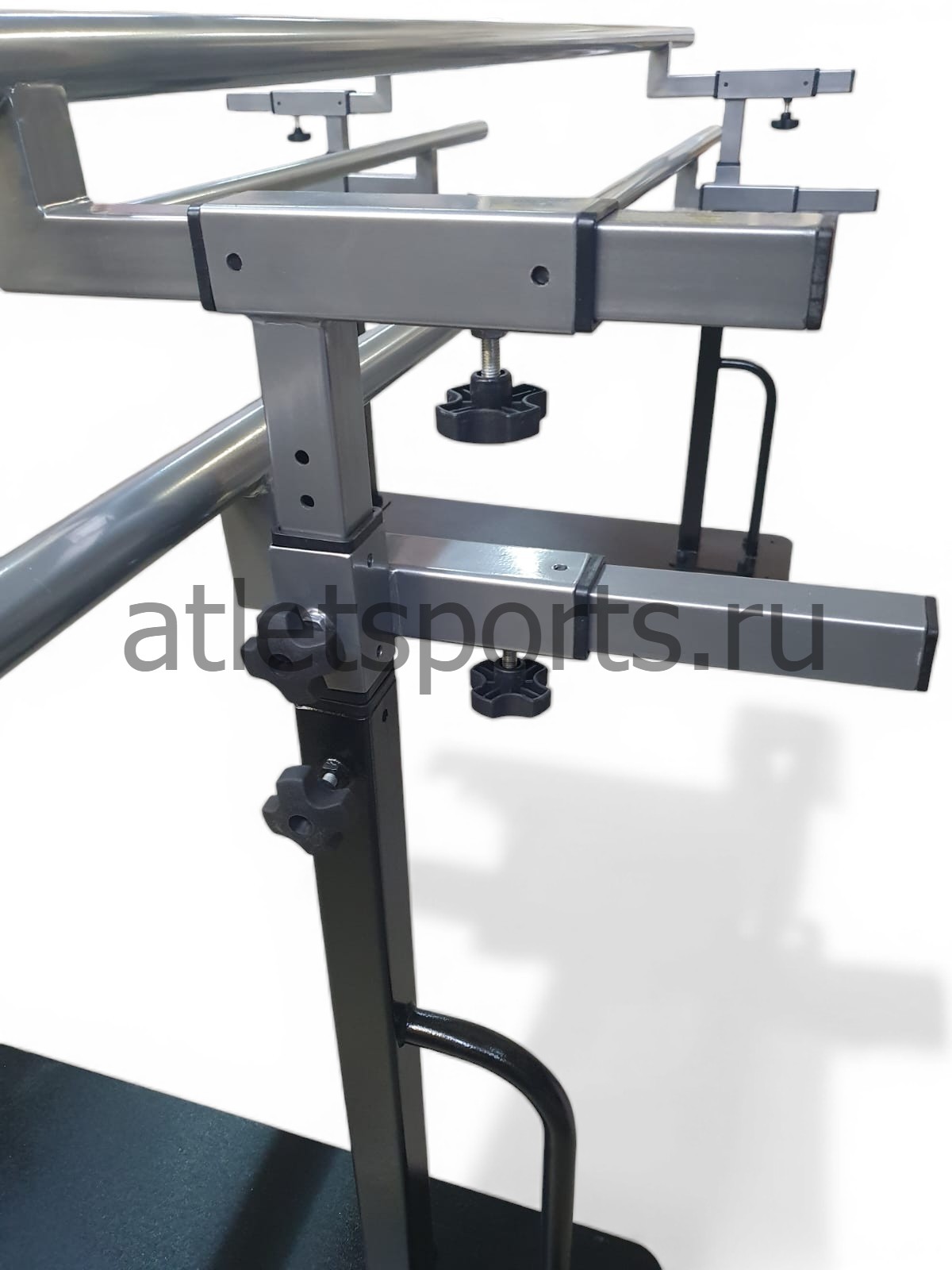 • Два уровня перекладин: верхние перекладины предназначены для опоры подмышками, что помогает распределить нагрузку и улучшить равновесие, а нижние — для удержания руками, что способствует укреплению мышц верхней части тела и улучшению координации движений.