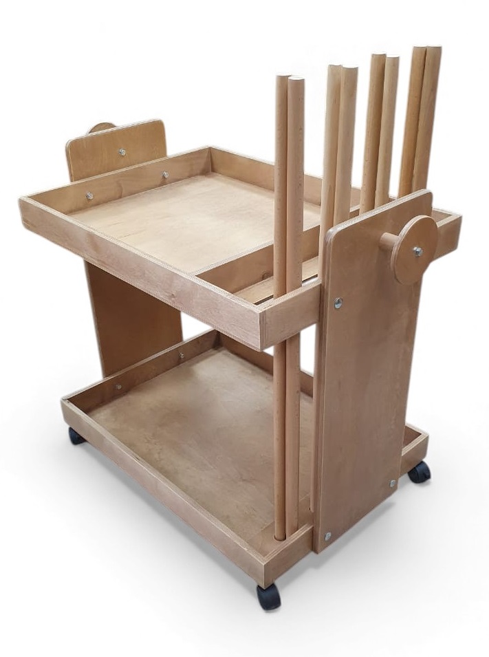 Размеры тележки - длина с ручками 990 мм, ширина 600 мм, высота с колесиками 820 мм, что делает её достаточно компактной и мобильной. Изготовлена из прочной фанеры с качественным покрытием, что обеспечивает долговечность и защиту от внешних повреждений.