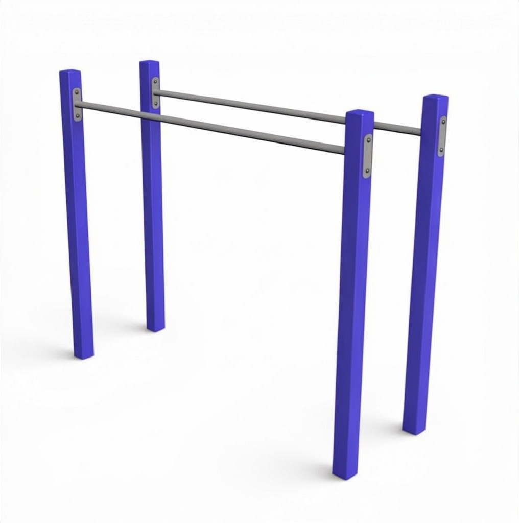 Перекладины брусьев выполнены из надежной круглой трубы диаметром 33 мм, но также возможно изготовление с диаметром 42 мм. Установка комплекса производится методом бетонирования в грунт или на подготовленное бетонное основание с помощью анкеров через специальные площадки.